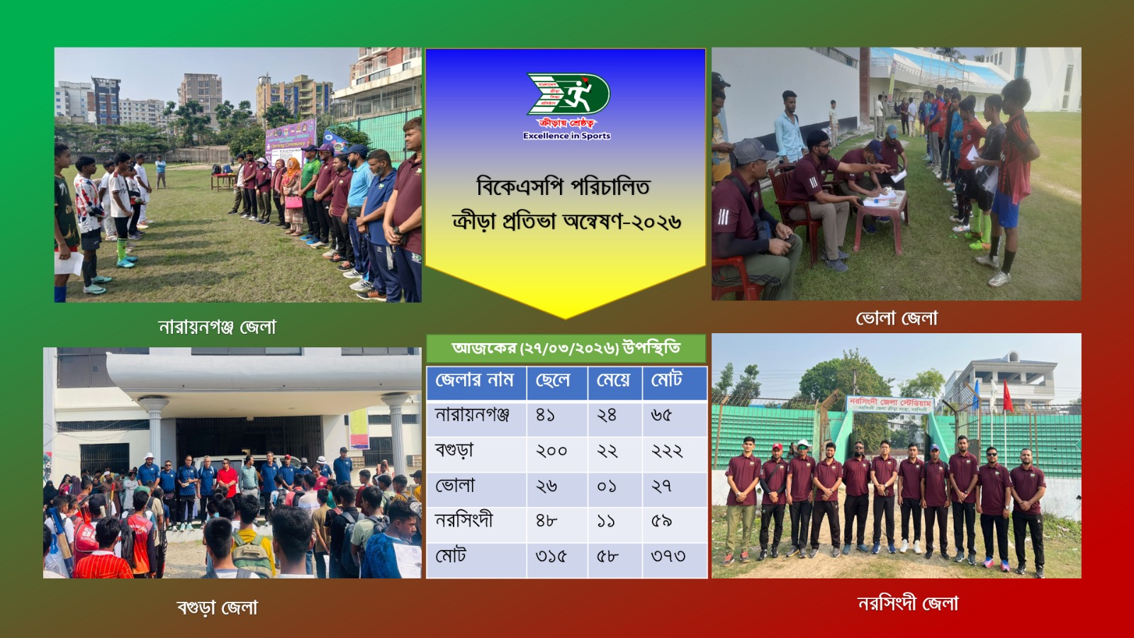 ১ বিকেএসপি পরিচালিত ক্রীড়া প্রতিভা অন্বেষণ-২০২৬ চলমান (২৭/০৩/২৬ তারিখের নারায়নগঞ্জ, ভোলা, বগুড়া ও নরসিংদী জেলার স্থির চিত্র) ২৮-০৩-২০২৬ দেখুন ২ ইয়্যুথ ভলান্টিয়ার অ্যাওয়ার্ড ২০২৬ প্রদানের নিমিত্ত Expression of Interest (EOI) বিজ্ঞপ্তি ২৪-০৩-২০২৬ দেখুন ৩ ইয়্যুথ ভলান্টিয়ার অ্যাওয়ার্ড এবং অনুদান কার্যক্রম অনলাইনের মাধ্যমে বাস্তবায়নের লক্ষ্যে নতুন সফটওয়্যার তৈরির নিমিত্ত Expression of Interest (EOI) বিজ্ঞপ্তি ২৪-০৩-২০২৬ দেখুন ৪ উপপরিচালক (প্রশিক্ষণ) জনাব উজ্জল চক্রবর্তীর ভারত সফর সংক্রান্ত সরকারি আদেশ ২০-০৩-২০২৬ দেখুন ৫ বিকেএসপি’তে নিয়োজিত কর্মকর্তা-কর্মচারীদের জ্যেষ্ঠাতার খসড়া তালিকা সম্পর্কিত বিজ্ঞপ্তি প্রকাশ ১৭-০৩-২০২৬ দেখুন ৬ ২৭/০৩/২০২৬ তারিখে অনুষ্ঠিতব্য যুবদের আত্মরক্ষামূলক মৌলিক প্রশিক্ষণে মনোনিত প্রশিক্ষণার্থীদের নামীয় তালিকা (ঢাকা, বরিশাল, চট্টগ্রাম, দিনাজপুর, খুলনা, সিলেট, কক্সবাজার) ১৫-০৩-২০২৬ দেখুন ৭ বিকেএসপি’র প্রাক্তন উপপরিচালক শামীমা সাত্তার মিমুর মৃত্যু সংক্রান্ত শোক বার্তা ১৫-০৩-২০২৬ দেখুন ৮ ০৪ মার্চ ২০২৬ তারিখে অনুষ্ঠিত দৈনিক সম্মান ভিত্তিক জনবল নিয়োগের লিখিত পরীক্ষায় উত্তীর্ণ প্রার্থীদের তালিকা ০৯-০৩-২০২৬ দেখুন ৯ জাপানে অনুষ্ঠিতব্য "Sanix Cup International Youth Soccer Tournament-2026" এ বিকেএসপি'র প্রশিক্ষণার্থী ও কর্মকর্তাদের অংশগ্রহণের সরকারি আদেশ ০৬-০৩-২০২৬ দেখুন ১০ দরপত্র বিজ্ঞপ্তি ০৪-০৩-২০২৬ দেখুন